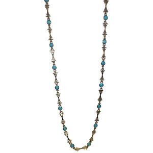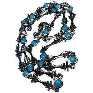 Crafted from an extraordinary combination of faux blue turquoise, silver tone, and vintage elements, this station necklace showcases an attractive bohemian and minimalist style.