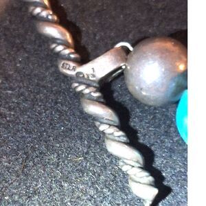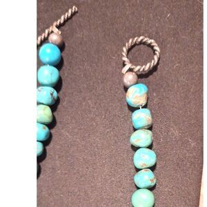 Beautiful blue Turquoise stones strung on wire with 2 Navajo Pearls and a sterling silver toggle clasp.