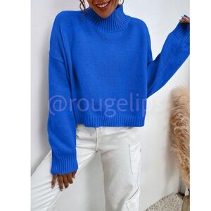 Blue Turtleneck Oversized Pullover Knit Sweater Drop Shoulder