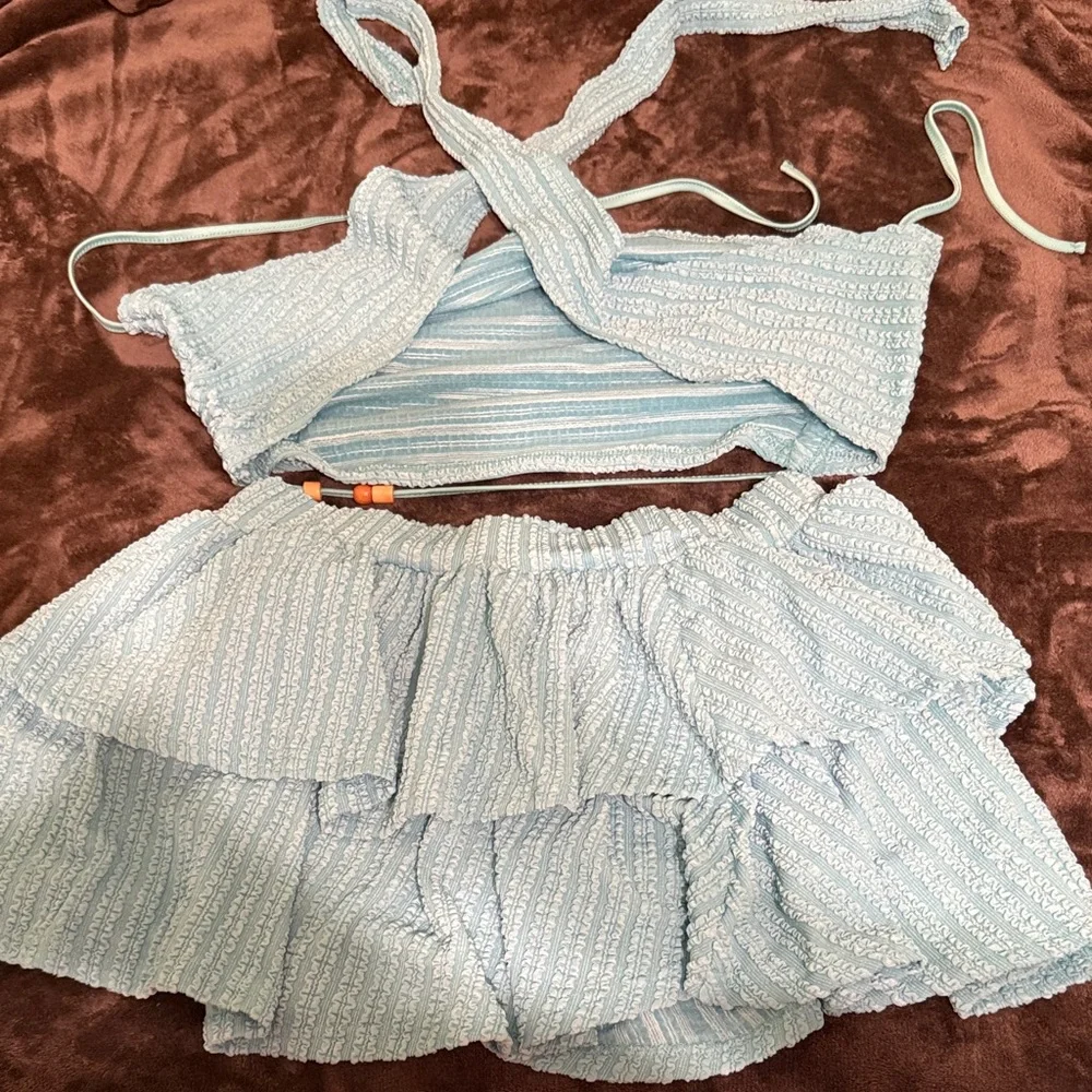 Chic blue two-piece set with ruffle details. Perfect for a stylish look. It’s much more of a ocean/turquoise blue than what is shown.