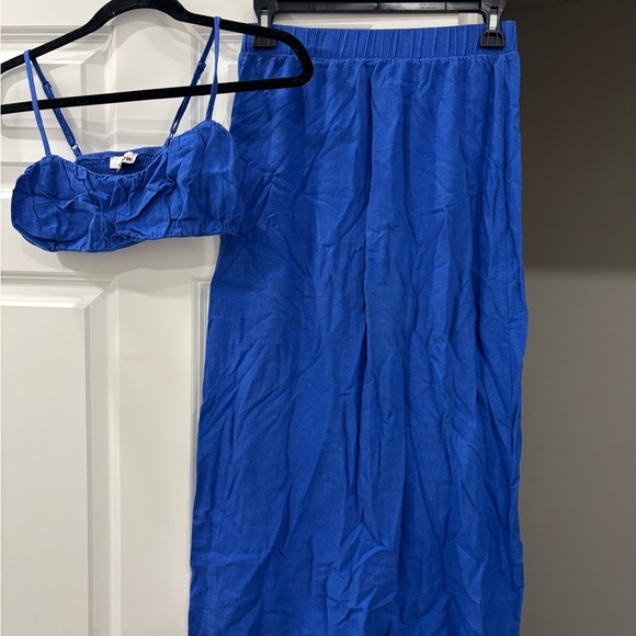 Stylish blue two-piece set featuring a bra top and long skirt. Perfect for the beach !! Will steam before shipping (sorry!!)
