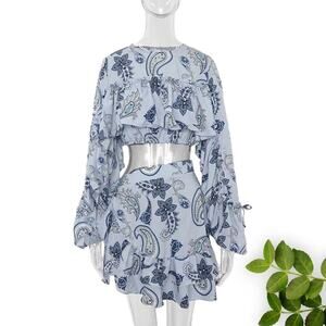 Blue V-Neck Collar Blouse with Butterfly Ruffle Sleeves and Skirt Outfit Set