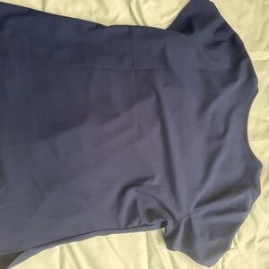 Comfortable blue V-neck scrub top with short sleeves and front pockets.