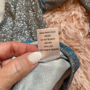 Blue V-Neck blouse Puff sleeve blue silver shimmery top medium