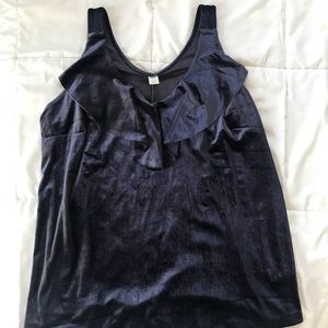 Blue velvet feel tank with v-neck and ruffle at bust. Perfect under a cardigan or dressed up for a party!