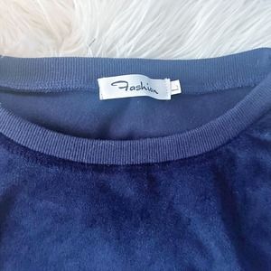 Blue soft velvet pullover sweater. Crewneck. Cute front twist knot detail on the front.