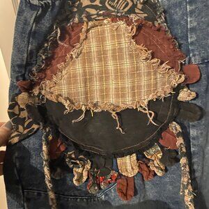 Super cute patchwork overalls by Blue Velvet. Lots of cute patchwork on the front and two back pocket on the back. The legs have ties at the bottom to tighten or wear loose. Size medium. Wore and washed once.