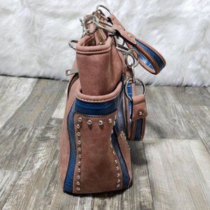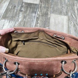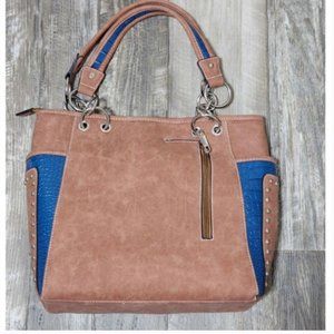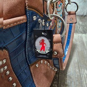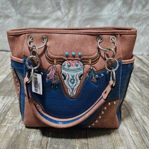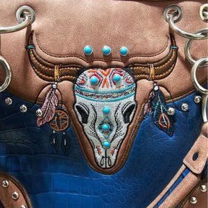 Western-themed handbag with Longhorn embroidery and leather-like materials. Interior features one zipper pocket and two open pockets within one big compartment. The back features a sideways zipper pocket. Faux Croc pattern