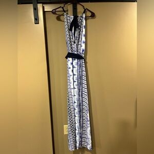 Blue White Abstract Summer Boho Halter Tie Neck Maxi Dress Size Medium Artistic
