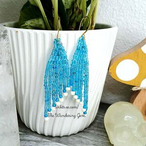 Blue & white beaded fringe cascade shoulder duster dangle earrings