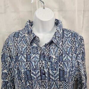 Blue White Boho Blouse Crinkled Gauzy Patchwork Retro Hippie Button Down XL