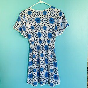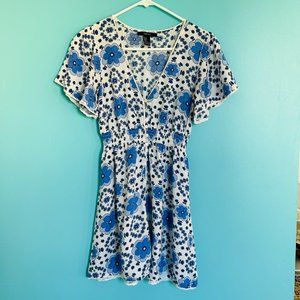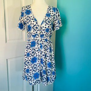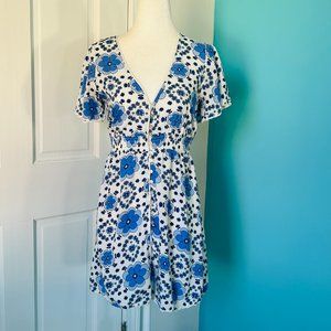 Blue & White Bold Floral Boho Summer Mini Dress (size S)