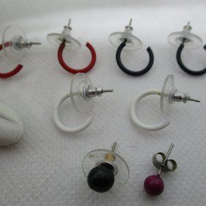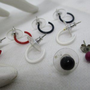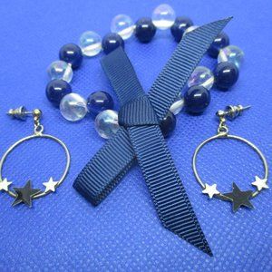 Never used navy blue and clear white plastic and Lucite beaded stretch bracelet with navy blue bow and a pair of gently used gold tone metal hoop earring with enamel black stars that can look navy blue and enamel white stars. Receive free gifts with purchase, 3 pairs of small enamel pierced hoop earrings, 1 pair of small pierced ball earrings a black ball & red ball (the red ball earrings will have a large plastic earring back when shipped) and 5 pair of butterfly earring back.