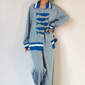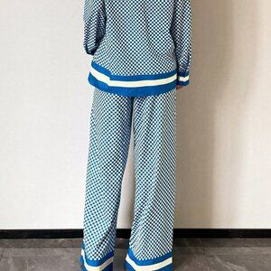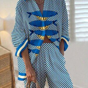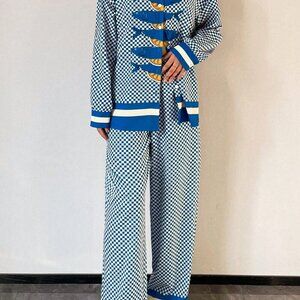 Blue & White Casual Women's Beach Oversized Plaid Long-Sleeved Shirt & Trousers