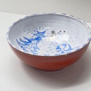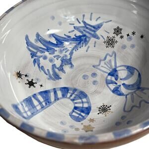 Blue & White Christmas Pottery Bowl with a Candy Cane, Peppermint, and Tree