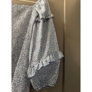 A chic smocked midi dress featuring a blue and white floral print with ruffled details on the sleeves and hem. Elasticized cuffs and smocking ensure a comfortable fit. Perfect for adding a touch of elegance to casual or semi-formal occasions.
