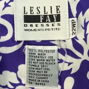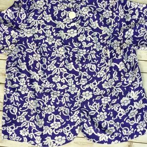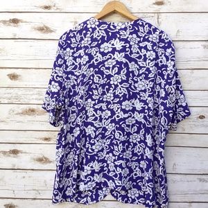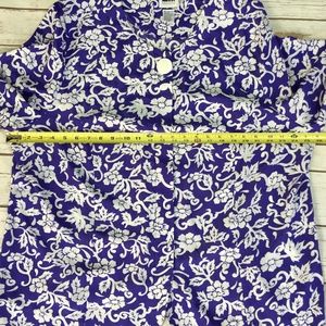 Blue and white Leslie Fay floral plus size print top. Wonderful summery short sleeve top or blouse has one large white button at the top, a hidden button placket and rounded front panels at the bottom. The blue color has just a hint of purple in it. 100% polyester. Size 22WP, measures about 26 inches across from armpit to armpit and about 26.5 inches in length in back and up to 29 inches in front. B3