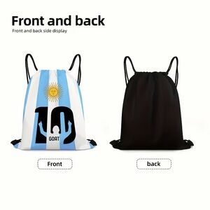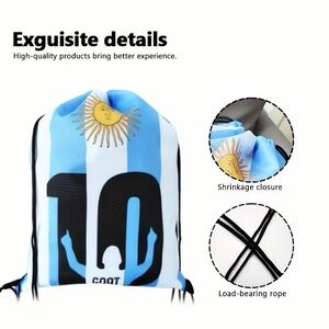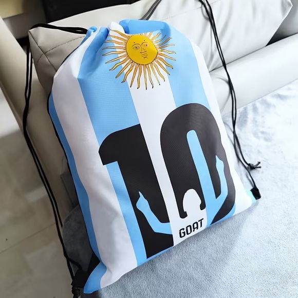 Lightweight drawstring backpack in blue and white with bold GOAT graphic. Smooth, durable fabric for daily carry. Easy cinch closure and adjustable cord straps. Stylish Argentina-inspired colorway suitable for gym or casual use.