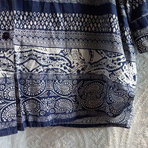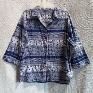 Blue & White Geometric Bandana Print Button-Down Top 3/4 Sleeve Size LG (T-211)