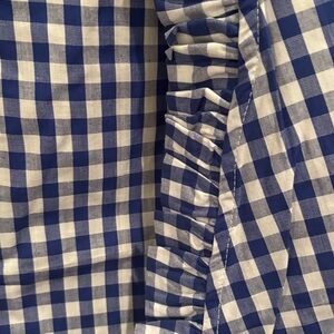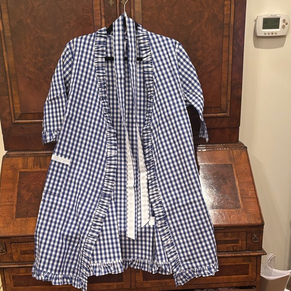 Lightweight gingham robe with ruffle trim. Soft, breezy fabric. Casual and charming look.