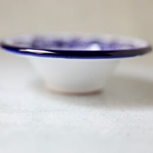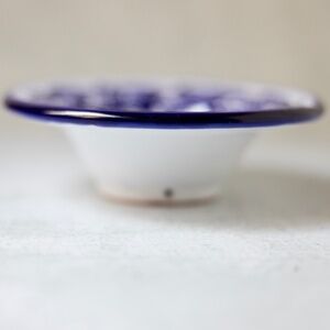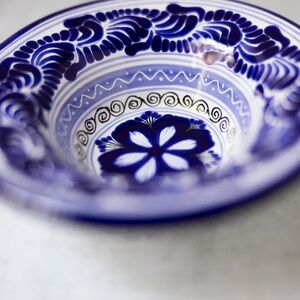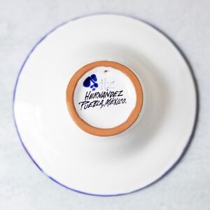 Beautiful pottery bowl marked Hernandez of Puebla, Mexico. Blue and white design with different patterns around the rim and inside with a flower at the center. Measures 6" across at the edge and 4.5" across the middle bowl part, which is about 1.5" deep. No defects noted; anything in the photos that looks like smears in the design are reflections. From my smoke- and pet-free home.