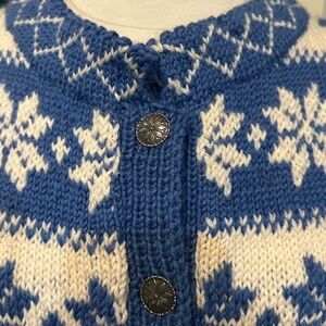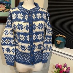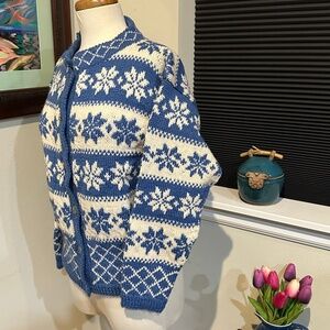 Blue & White Norwegian Snowflake Hand Knit Wool Cardigan Sweater / One Size