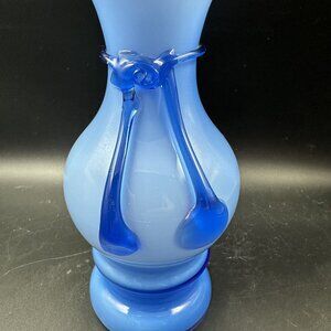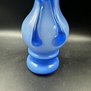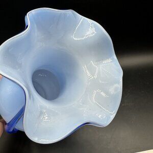 Blue White Overlay Ruffled Edge Vase Applied Glass Bow 8" Ombre Effect Rigaree