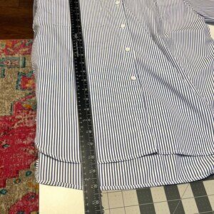 ITEM DETAILS: This is a beautiful blue & white pinstriped shirt. It features white buttons down the front, smocked gathered long sleeves, front breast pocket and POCKETS AT EACH HIP!!!! So pretty and super comfy! Measures 23.5 in. across chest, 28 in. from shoulder to end of smocked sleeve, 30.5 in. from shoulder to front hem and 32.25 in. from shoulder to back hem. Size XL, but because of the oversized fit, it fits more like a 1X. So comfy.