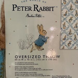 Cozy Peter Rabbit throw in white with light blue and brown accents. Soft fleece will keep you warm and comfortable. Charming Peter Rabbit design adds playful style to bedtime or playtime. Easy-care fabric for everyday use.