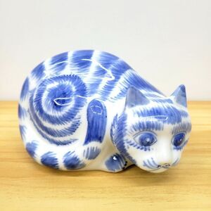 blue and white porcelain cat, chinoiserie décor, curled sleeping cat figurine, vintage feline collectible, Delft style cat, cottagecore décor, ceramic cat statue, blue willow style