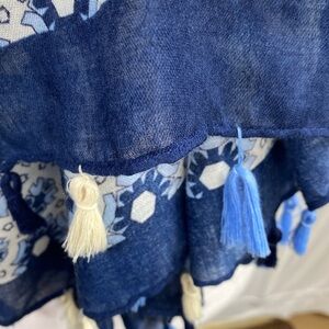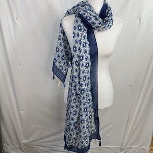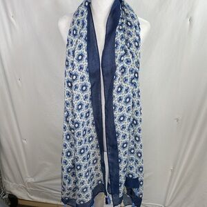 Blue & White Scarf Wrap Shawl with Fringe. Good pre owned condition. See photos of Fringe for missing thread.