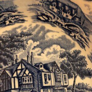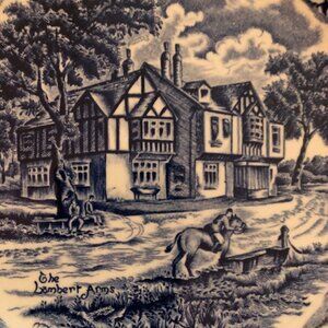 The bowl is round with a little bit of "wave" to the edges. I've tried to capture this in the photos. There is no fading, chips, cracks or scratches. The bowl features "The Lambert Arms Inn". Includes lush trees, birds, and smoke wafting out of a chimney. It's really lovely! The bowl will help set a beautiful table. And would be equally outstanding as a display piece on your buffet or added to your "plate wall."