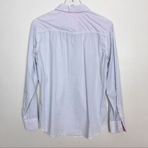 Beautiful fabric and larger-than-usual white buttons on this blue and white striped button down with left breast pocket. Interior of the yoke and cuffs is pink gingham checks. Hem is serged but not hemmed. Excellent condition. Size M.