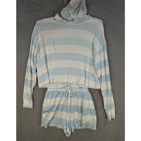 Blue White Striped Pajama Set Hoodie Top & Shorts Women’s FITSLIKE Medium Lounge