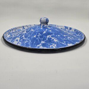 Fabulous fun find - very vintage Enamelware Agateware Graniteware Lid in Gorgeous blue and white swirl pattern with black rim