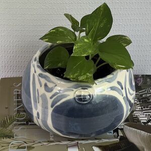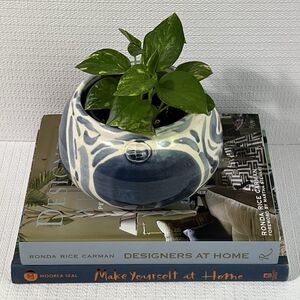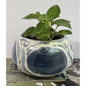 Blue & White Swirl Stoneware Planter Flower Pot Round Wheel Thrown Maker’s Mark