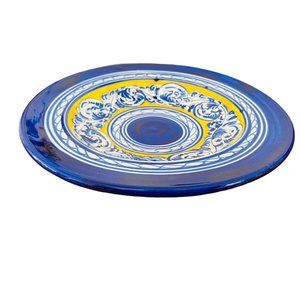 This beautiful multicolored shallow bowl plate is perfect for any occasion. Crafted from high-quality ceramic material, it measures 9 3/4 inches in length and is marked Sevilla for authenticity. The unique design features a combination of blue, white, and yellow shades, making it a great decorative piece for any space. Use it as a plate or as a bowl to serve your favorite dishes or as a wall hanger plate.