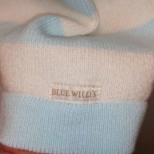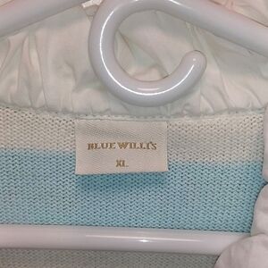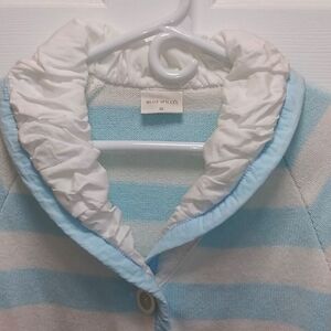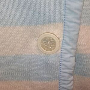 Beautiful light blue and white striped button-up sweater with quilted collar. There's a very light stain on bottom back of left sleeve, see last pic. Smoke free home. Approx. measurements: