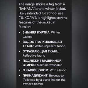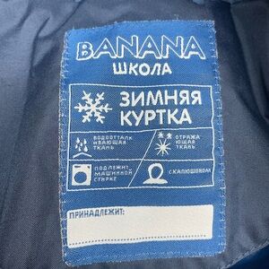 "BANANA" brand winter jacket, likely intended for school use ("ШКОЛА"). It highlights several features of the jacket in Russian: