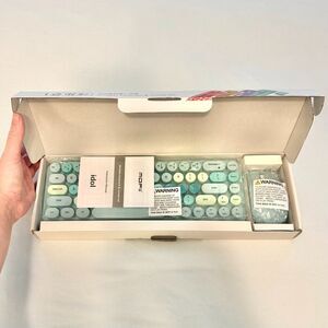 Channel vintage vibes with this mini wireless typewriter keyboard, paired with a precision mouse in a sleek, on-trend color. This combo provides whisper-quiet typing and click-free mousing for a productive and peaceful workspace. The keyboard is about 12.5 inches in length. Requires two AAA batteries for the keyboard and one AA battery for the mouse (not included). Comes in original packaging with user manual included. Functionally has been tested and works as intended