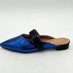 Blue Women Buckle Strap Mule Flats Backless Loafer Pointed Slip On Mule