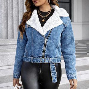 Blue Preppy Womens Teddy Lined Drop Shoulder Buckled Belted Moto Denim Jacket