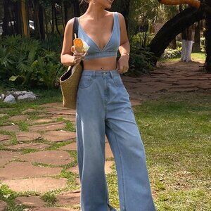 Blue Women's Washed Denim Camisole Top & Wide Leg Pants Casual Vacation Outfit