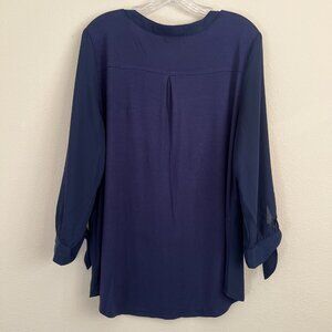 Rayon Front with Jersey back makes it look professional but is breathable. I am a size 14 and it hung a bit low in front which means it's better for someone a bit wider front to back than I am. Looks professional but also breathes well and is comfy. Works with dress pants and skirts. I'm bummed this didn't fit me better. It ticks all the boxes.