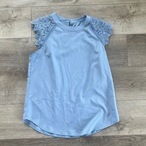 Light blue sleeveless work top. Crotchet shoulders and button in the back. Size M no brand.