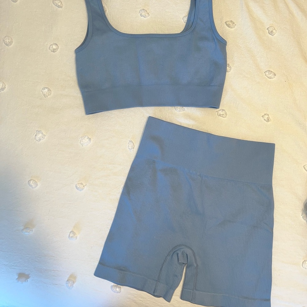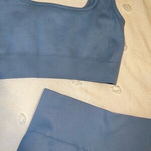 Great quality blue workout set from Amazon! Lightly worn but in good condition. Comes with the shorts and sports bra combo. Size M.