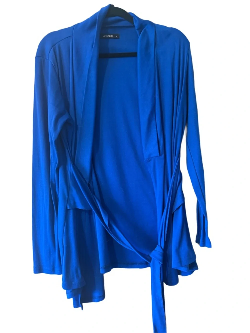 Lightweight blue wrap cardigan. Open front with self-tie belt. Long sleeves and draped hem. Versatile layering piece.