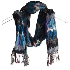 Blue Zig Zag Knit Scarf Fringed Marled Rectangular Wrap