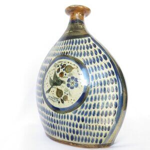 Blue vase Mexican pottery vintage bird motif floral design with brown and gray
