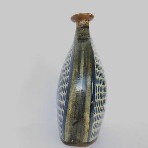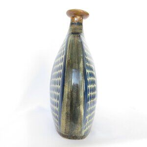 There are a lot of Tonala vases on Poshmark and Ebay, however, this particular shape and size seems to be pretty rare as I couldn't find anything similar. It has deep royal blue hues with variations of browns, grays on a stone color background. It measures 13" h x 11" w.